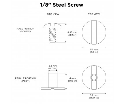 Use these 1/8” inch long stainless steel rivets to attach materials together. This steel rivet is composed of one screw (female side) and post (male side) which can be easily installed using a flat head screwdriver. Size of the rivet is shown in the diagram and will fit holes as small as 5 mm and as large as 9 mm with a maximum thickness of 8 mm or 0.3 inches. Attachment instructions included with purchase.